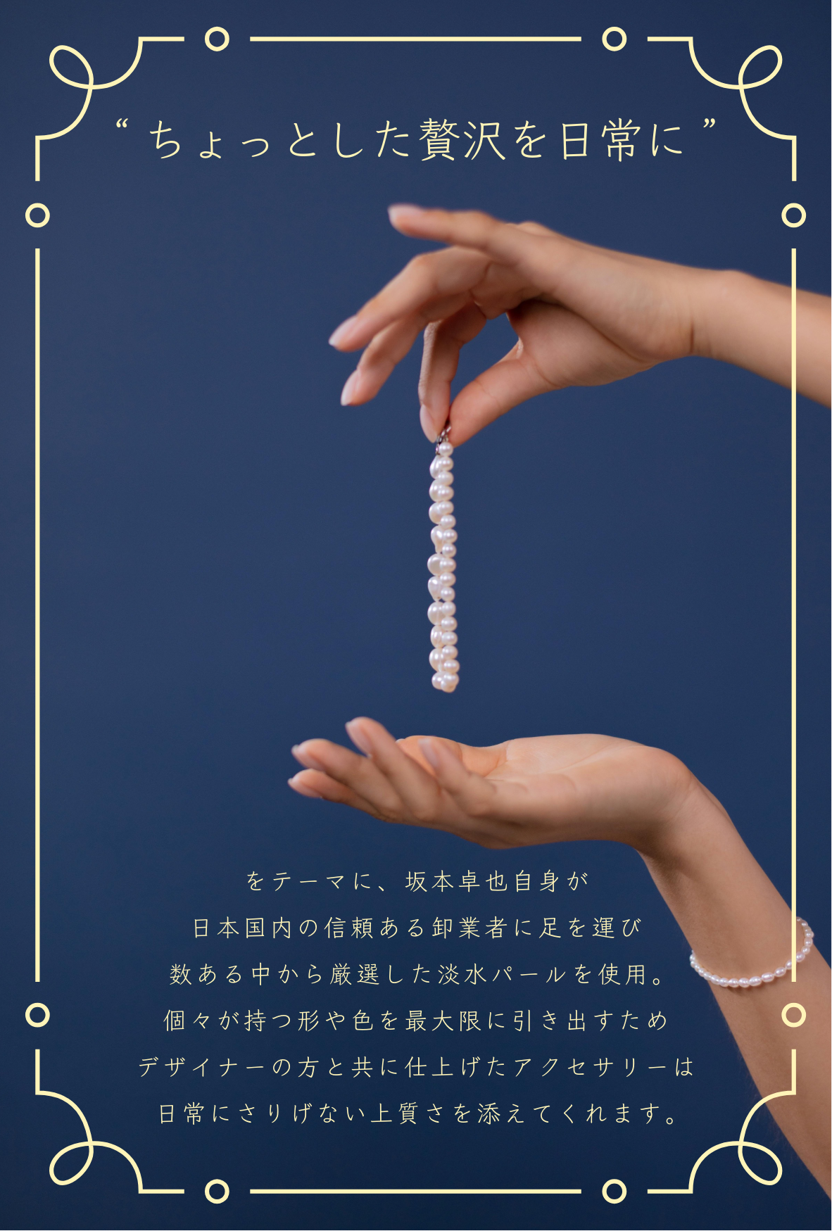 “ちょっとした贅沢を日常に”をテーマに坂本卓也自身が日本国内の信頼ある卸業者に足を運び、数ある中から厳選した淡水パールを使用。個々が持つ形や色を最大限に引き出すため、デザイナーと共に仕上げたアクセサリーは日常にさりげない上質さを添えてくれます。